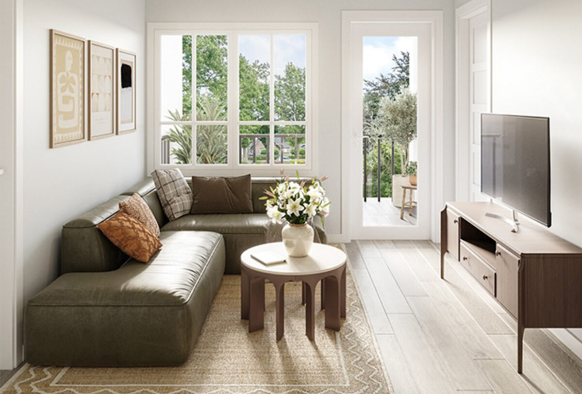 Interiors balance durability and comfort with luxury vinyl plank flooring throughout main living spaces and soft, warm grey carpeting in the bedrooms. Knockdown ceilings and a contemporary lighting package, professionally selected by designers, create a clean, cohesive backdrop for everyday living.