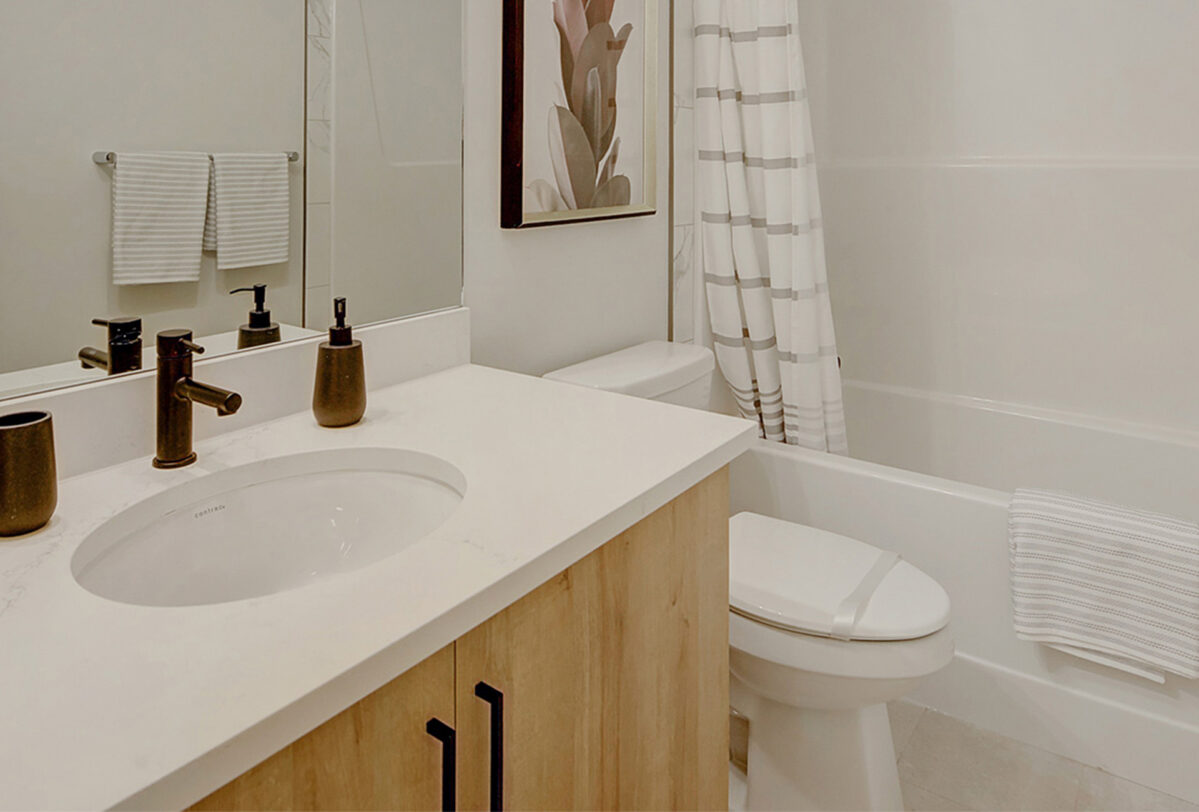 Bathrooms feature modern slab-style vanities with quartz countertops and tiled backsplashes, paired with sleek Moen chrome fixtures. High-efficiency toilets come standard, with pedestal sinks in select powder rooms for a clean, streamlined look.